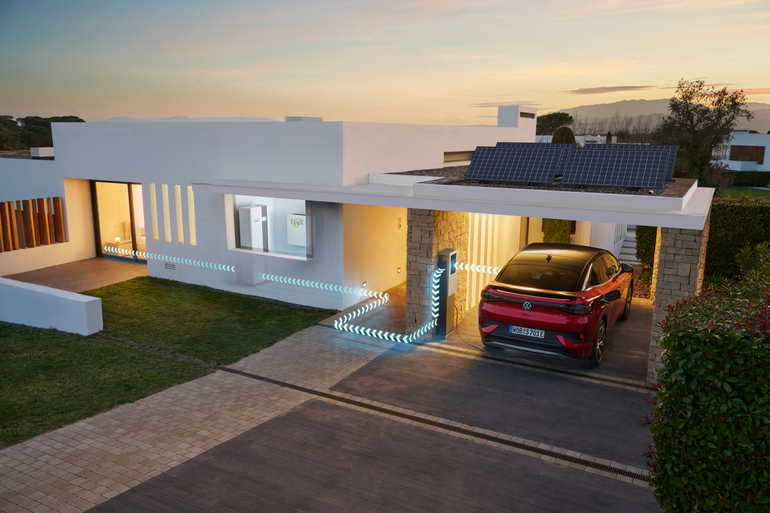 ID.-Modelle mit der 77 kWh-Batterie können mit der Funktion des bidirektionalen Ladens künftig als ergänzender Stromspeicher für das Haus dienen. VW will die Funktion auch für bereits ausgelieferte Fahrzeuge freischalten können, sobald diese ebenfalls die ID.-Software 3.5 per Update erhalten haben. Durch die hohe Speicherkapazität der Autos kann ein Haus auch über mehrere bewölkte Tage hinweg mit Solarstrom versorgt werden.