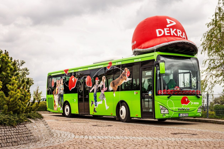 Der Dekra "Kinderkappen-Bus" heißt im Sprachgebrauch so, weil seine Beklebung die Kampagne "Sicherheit braucht Köpfchen" aufgreift. Seit 20 Jahren sorgt Dekra damit in Deutschland zum Schulstart für mehr Sicherheit: Kinder bekommen signalrote Kappen mit retroreflektierenden Elementen, die für mehr Sichtbarkeit sorgen, und werden gleichzeitig im Blick auf das richtige Verhalten im Straßenverkehr geschult.