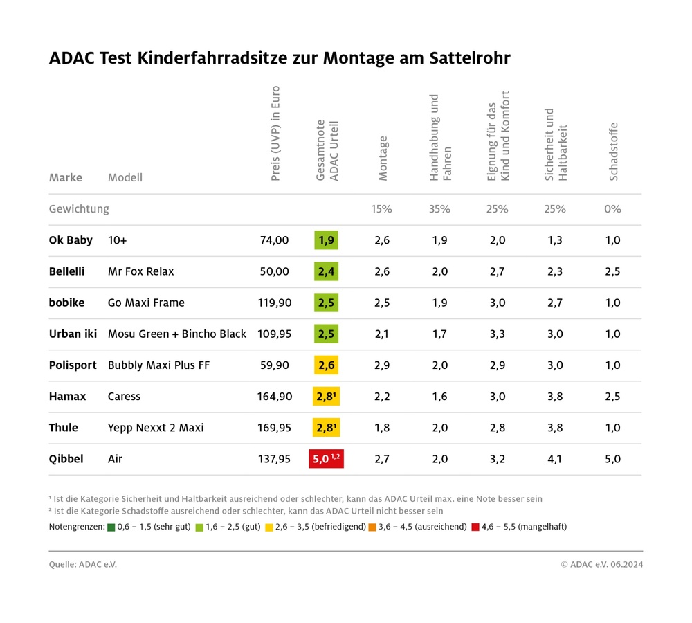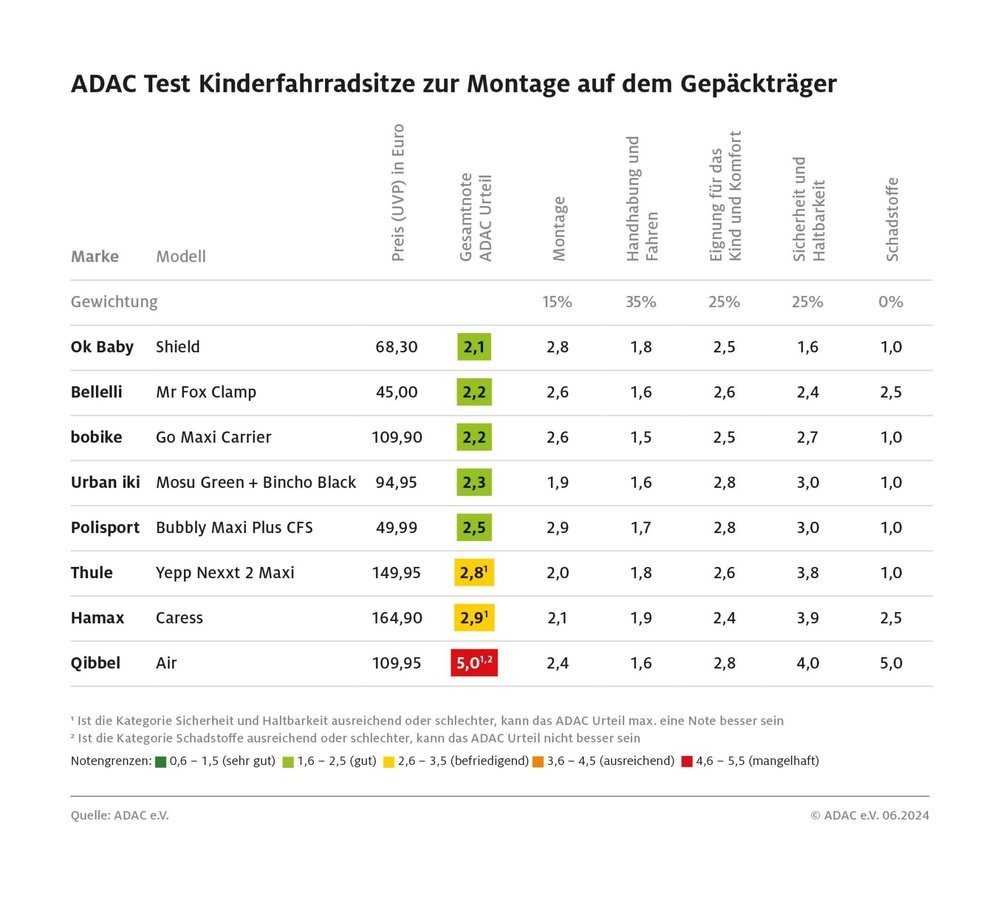 Der ADAC hat 16 Fahrradsitze für Kinder getestet. Dabei haben vor allem die günstigeren Fabrikate überzeugt. Neunmal wurde die Note 'gut' vergeben, fünf sind 'befriedigend' und zwei fallen durch.