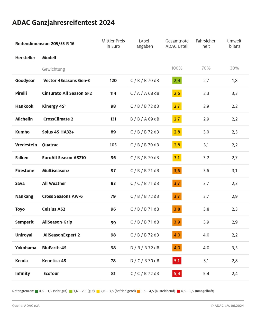 Ganzjahresreifen sind immer ein Leistungs-Kompromiss zwischen Fahreigenschaften im Sommer und denen im Winter. Der ADAC hat die Allwetter-Gummis erneut getestet. Ergebnis: Einer bekam ein 'gut', sechs schnitten 'befriedigend' ab, weitere sieben 'ausreichend', und zwei fielen mit 'mangelhaft' durch.