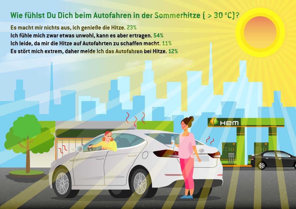Brütende Hitze im Auto macht die Fahrt nicht nur unangenehm, sondern noch dazu gefährlich. Eine aktuelle Umfrage der Tankstellenkette HEM zum Thema 'Autofahren bei hohen Temperaturen' zeigt, wie die Deutschen mit der Sommerhitze umgehen und welche Maßnahmen sie ergreifen, um im Straßenverkehr cool zu bleiben.