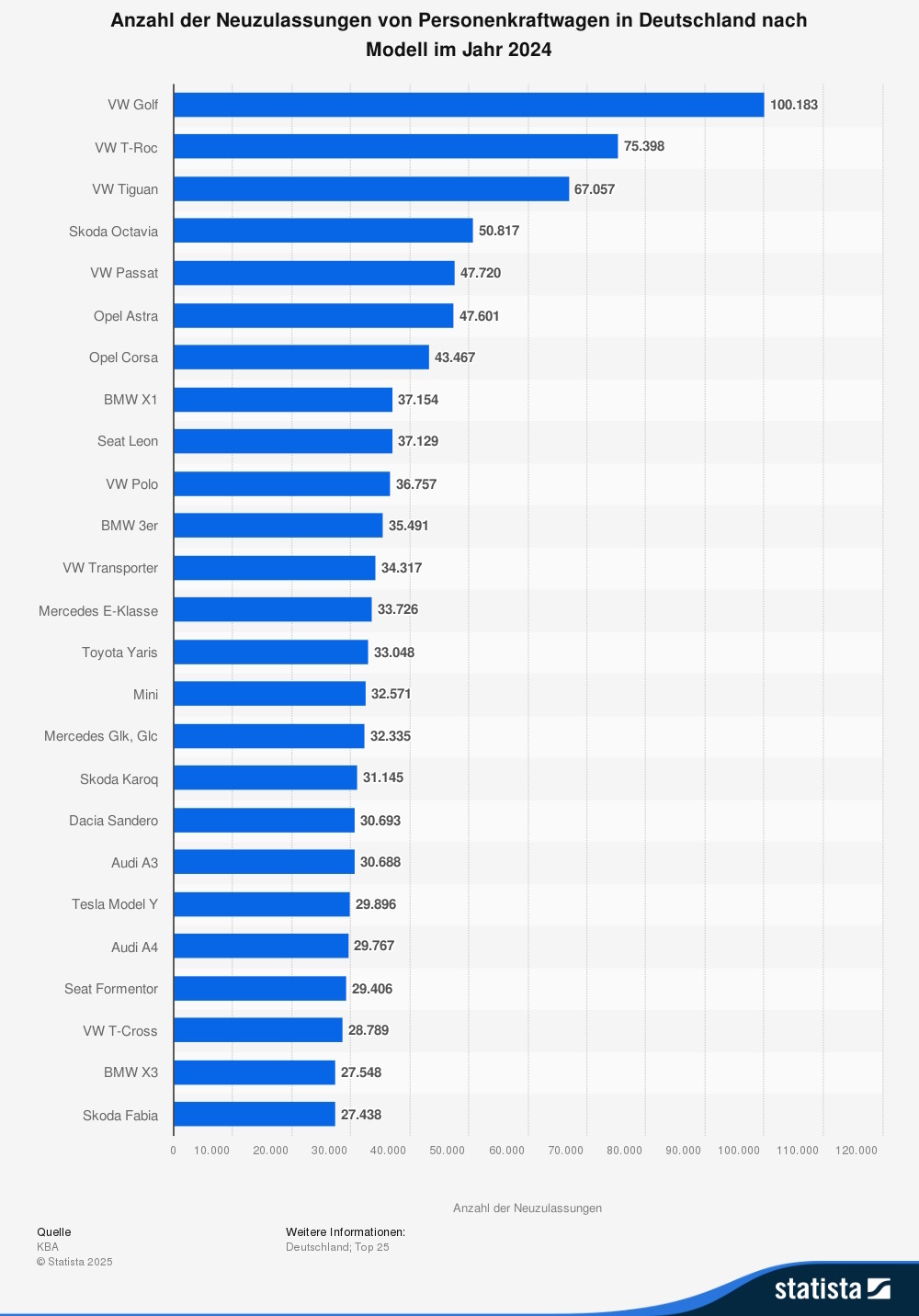 VW war auch 2024 Marktführer in Deutschland. Dies zeigt sich auch in den Top Ten der meistverkauften Pkw, in denen vor allem Modelle des Wolfsburger Konzerns zu finden sind.