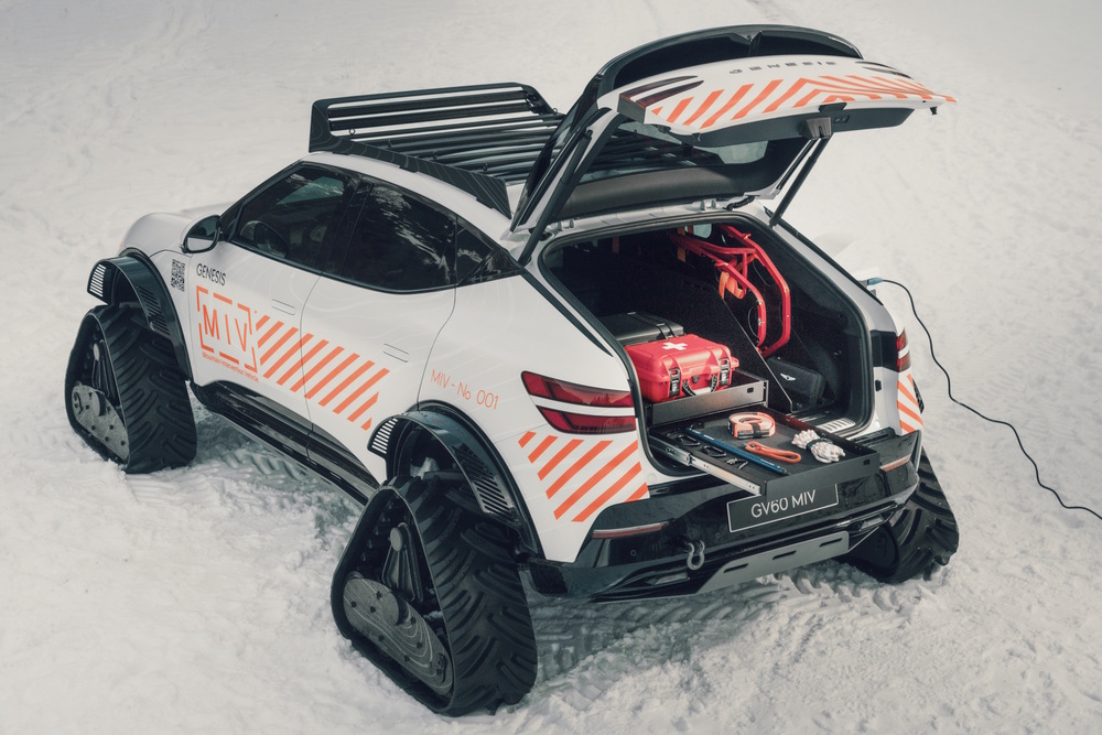 Um verletzte Alpinisten von steilen Hängen bergen zu können, braucht es Fahrzeuge mit extremer Kraxel-Kompetenz. Die hat Genesis nun seinem Elektro-Feger GV60 verliehen.