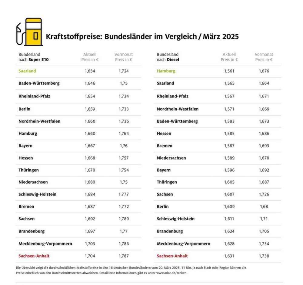 Die durchschnittlichen Kraftstoffpreise in den einzelnen Bundesländern. Photo: ADAC via Autoren-Union Mobilität