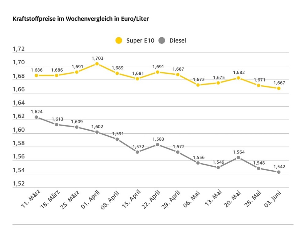 Die Entwicklung der Kraftstoffpreise in den vergangenen Wochen. Photo: ADAC via Autoren-Union Mobilität